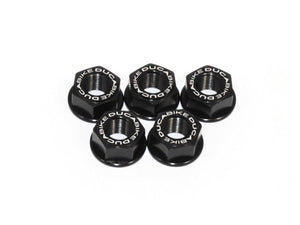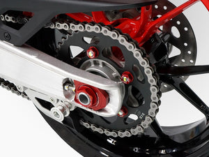 Kit of flange nuts for sprocket carrier made of solid machined ergal with colored surface anodization available in Red, Black, or Gold. Complete with mounting instructions, this kit is interchangeable with the original nuts.