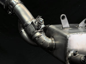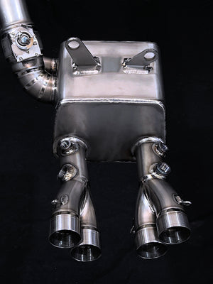 The R&D team at Vandemon believed that the project required a stealthy appearance to complement the stealthy nature of this exhaust system. Where the catalytic converter is replaced by a lightweight titanium bimodal muffler. When the power button is pressed, a titanium exhaust valve re-directs exhaust to the stealth muffler (quiet) and exits via the final unbaffled muffler for a quiet exhaust. When the power button is pressed again, the titanium valve will open, and the exhaust gases will bypass the Stealth Muffler and exit via the final unbaffled muffler with zero resistance for maximum sound and performance.