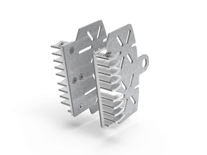 The main body of our heat sink is made of a special thermal steel with a high degree of heat conductivity. The material is first laser cut and then CNC machined in our workshops, the slots have two purposes, the first to reduce the contact surface, the second to release the hot air formed inside the brake piston cavity by reducing the hot chamber effect, and the propagation of heat in the piston and oil. The main body of the steel sink is connected to a light alloy heatsink made of a special aluminum with high thermal conductivity, which has the task of assisting the process of heat dissipation.