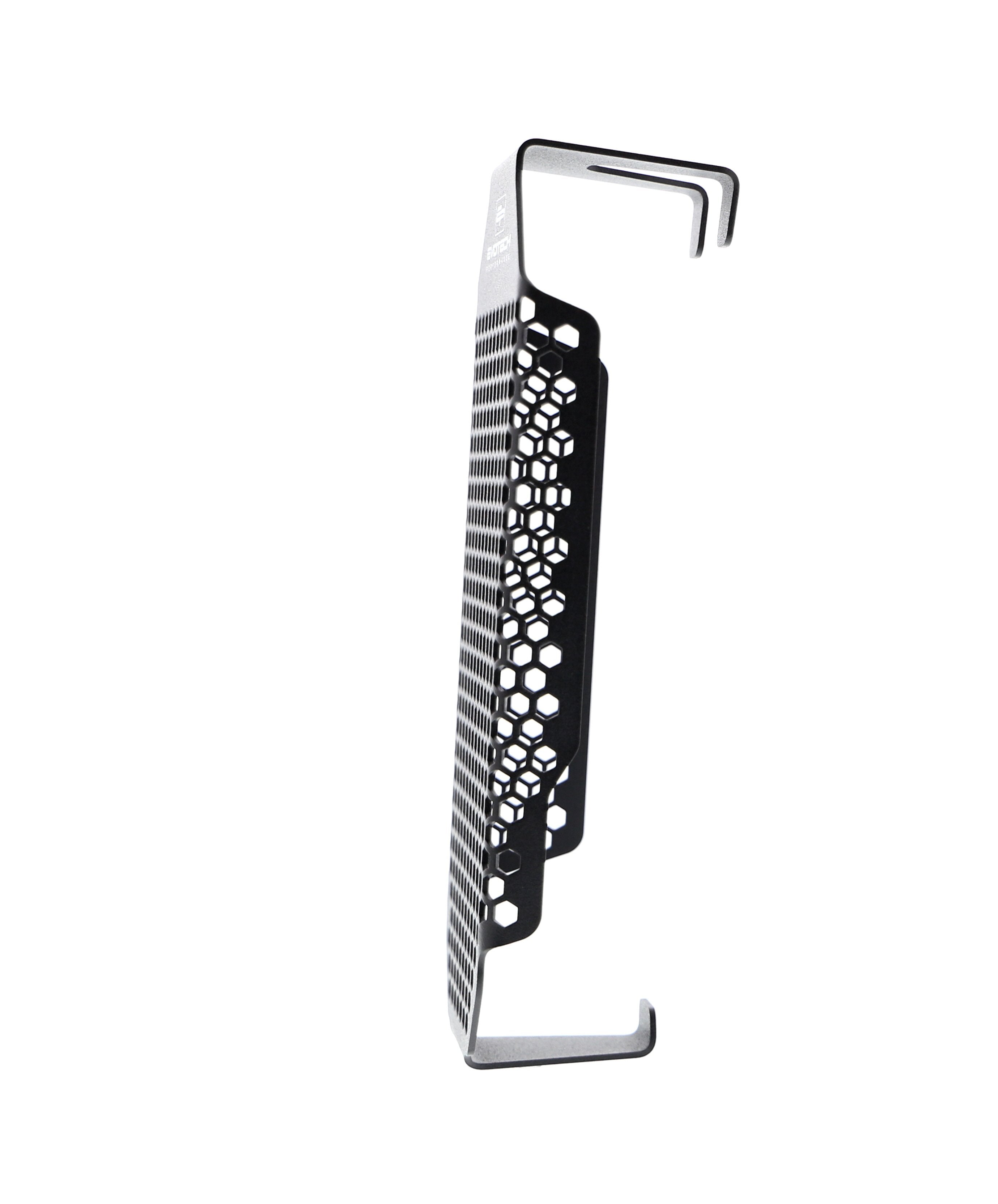 Hexagonal hole pattern to optimise airflow whilst providing maximum protection from road debris.