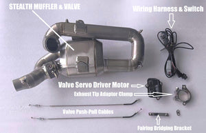 This replacement for the heavy and restrictive original muffler and catalytic converter is compact and lightweight. It boasts a titanium valve that allows the rider to alternate between Quiet Stealth mode and full power loud mode with a simple press of a button. This innovation allows the operator to avoid criticism and attention when needed and choose maximum performance and sound without guilt.