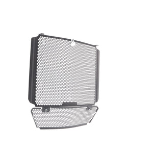 An EP radiator guard protects the Aprilia RS660 radiator from damage while allowing cooling air to pass through - and look good at the same time. A radiator's delicate cooling fins easily bend, and misaligned fins can cause overheating. The radiator's internal cores can also be holed by stones, etc; all usually picked up and flung directly into the radiator from the bike's front tyre or from other traffic. Leaking coolant will make the motorbike inoperable because of overheating, which can result in engine damage.