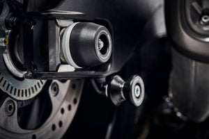 Sited either side of the rear wheel spindle, the EP Rear Spindle Bobbins are expected to take the initial impact in an incident. The durable materials and innovative design may save the swing arm and sprocket carriers from expensive harm. The nylon bobbin head and aluminium core are held through the rear spindle of the GSX-S950 by a rolled-thread stainless steel spindle rod. The nylon is free to move with impact to reduce stress on the wheel and improve durability.