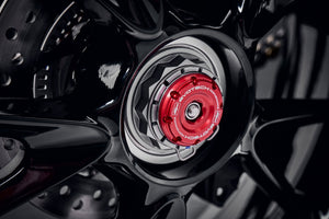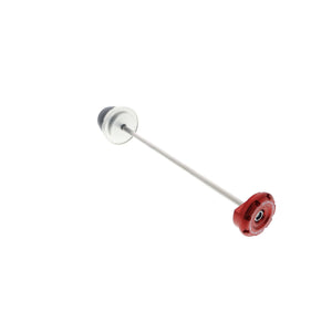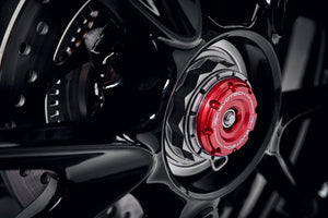 The Triumph Speed Triple 1200 RR single-sided rear swingarm hub is a target for expensive damage. Protect yours with the EP Rear Spindle Bobbins. The driveline side features a moulded nylon bobbin and aluminium spacer. The opposing side features a CNC-machined aluminium hub stop finished in striking red anodise to match the bike's styling accents. The protectors are held firmly via supplied stainless steel spindle and fasteners.