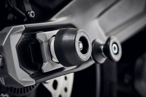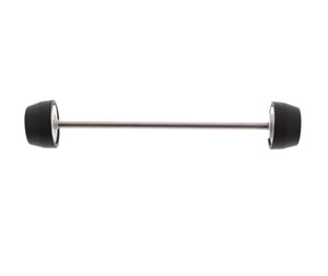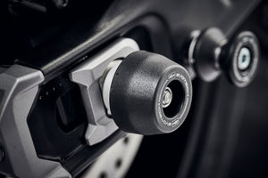 Fitted through the front and rear wheel spindles, the nylon bobbins and aluminium support of EP Spindle Bobbins Kit for the Triumph Trident are designed to protect the front forks, brake calipers, and swingarm. The bobbins protrude from each side of the wheel, hoping to take impact first, should an incident occur, aiming to reduce expensive damage. The bobbins are reinforced with an aluminium core, designed and machined to precisely fit each wheel.