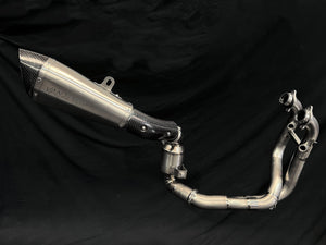 This exhaust is constructed using the highest quality Japanese Ti1 Titanium, resulting in reduced weight compared to the stainless steel OEM exhaust. It also eliminates the heavy catalytic converter, which hinders performance and sound. The design allows tuners to maximize performance from the two-cylinder engine by keeping the original muffler or by using the provided Titanium Muffler for even better results.