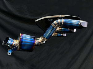 The surface finish is a natural brushed finish that, when heated, changes to an iridescent blue and red. Unlike stainless steel, Titanium won't stain, corrode or ever need polishing due to Titanium's high acid and salt resistance which also dissipates heat twice as fast as steel, further safeguarding against extended heat soaking into body panels when stationary.