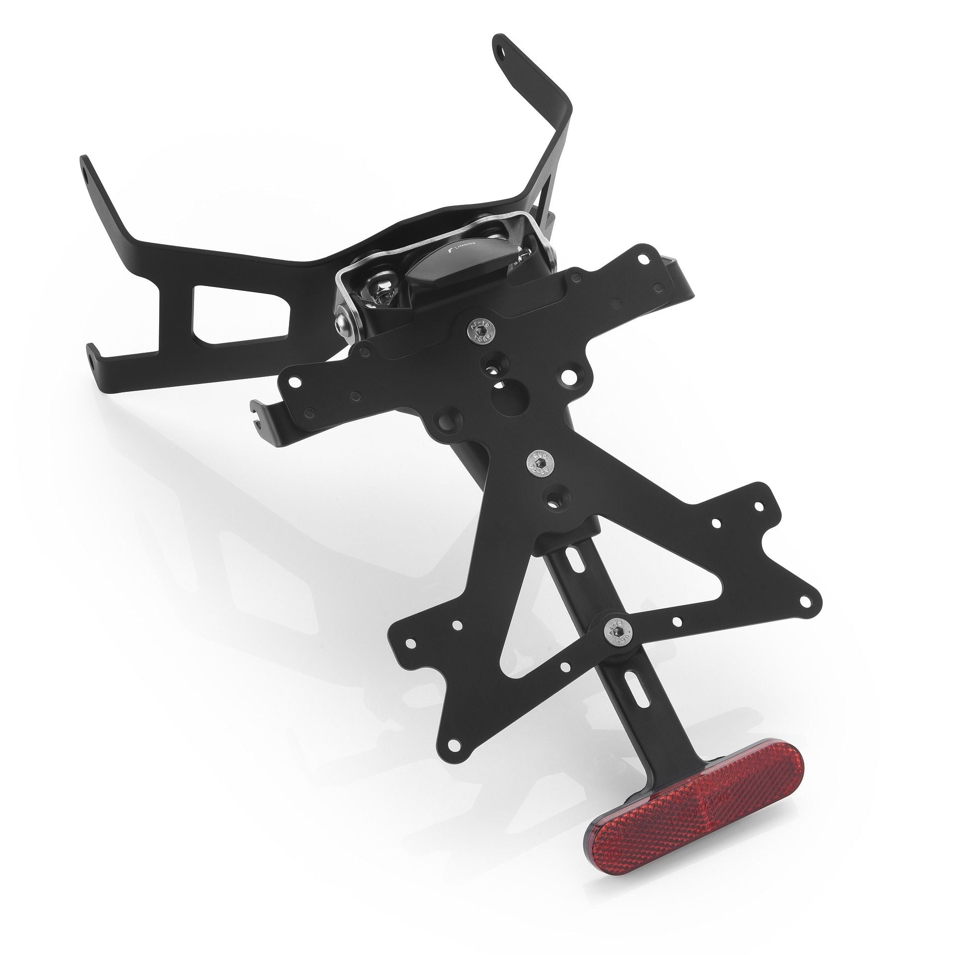 The kit includes a 173x173 mm plate holder, a 166x89.5 mm US plate holder, Rizoma indicator supports, SMD LED plate light (homologated) and reflector.