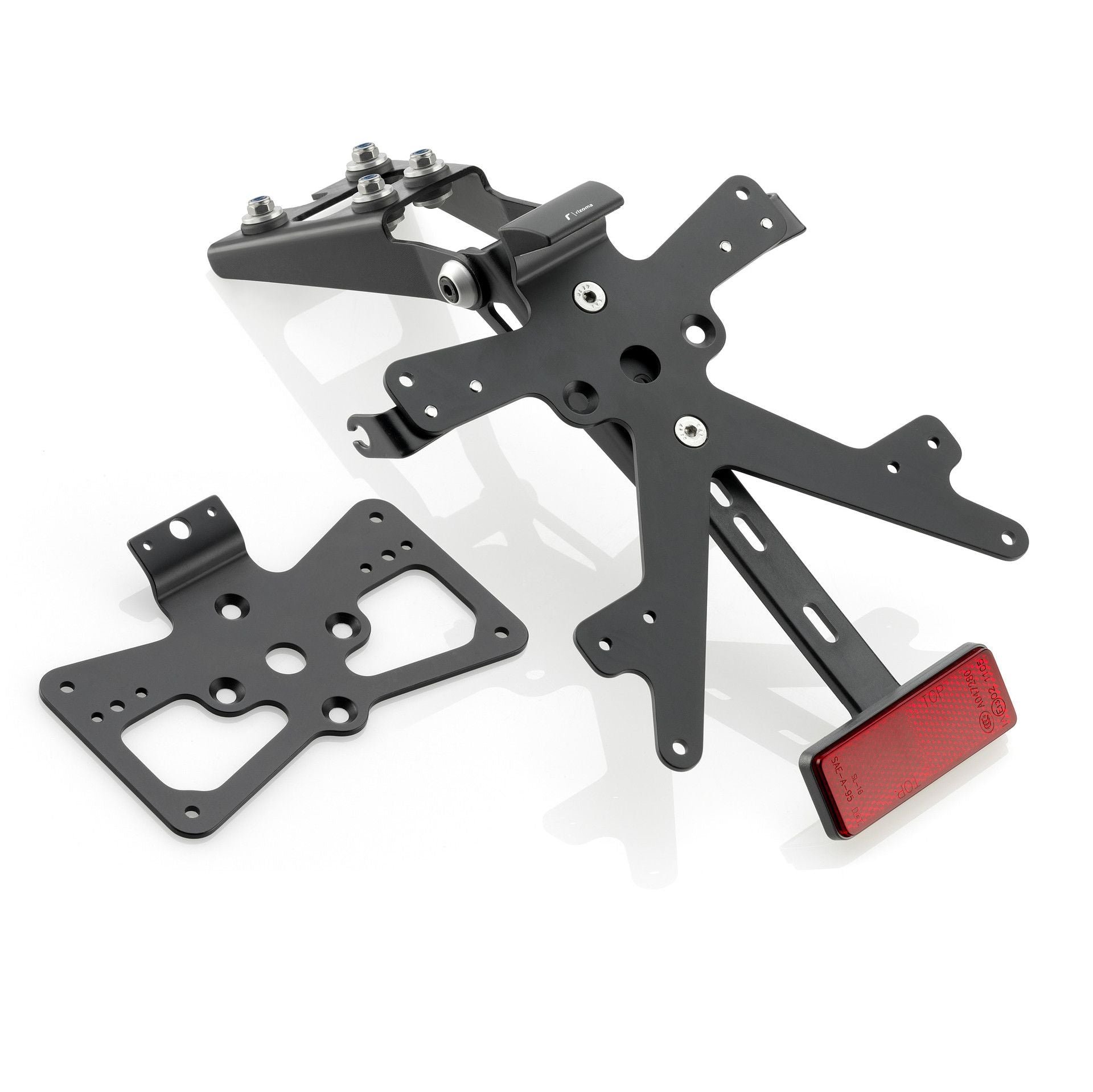 Made from aluminum, each Fox license plate kit is specifically designed for a corresponding motorcycle model. This means it matches the motorcycle styling perfectly and is quick and easy to install. Each kit actually includes everything required to fit it without requiring any modifications to OEM parts. Great functionality plus maximum compactness, but always in complete compliance with legal requirements. Fox kits include an SMD LED license plate light, reflector and Rizoma turn signal supports. They are adjustable and supplied with a safety lock to ensure the correct tilt.
