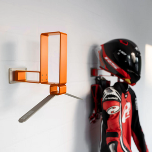 100% aluminum, the body satin powder coated, wall plate and bracket brushed and anodized. The minimalist design of the SUITBASE® PRO favors quick drying and facilitates the cleaning of the combi and helmet. Optional extensions allow our mount to be optimally adapted to your needs. By means of precisely defined radii, your equipment is stored gently. Pressure points on the helmet padding or protectors are avoided. Our mount easily holds 25 kg and is suitable for combis with airbag systems.