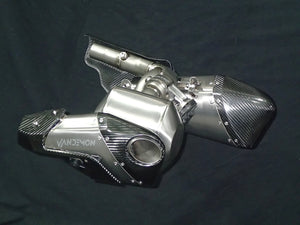 Due to increasingly stringent regulations worldwide, Vandemon has created a bimodal valved slip-on muffler that removes the OEM catalytic converter and heavy steel mufflers. This unique exhaust system offers two different tones, Quiet or Loud, which the rider can switch between using a button on the handlebars. Aside from the improved sound and performance, this exhaust also provides substantial weight savings.