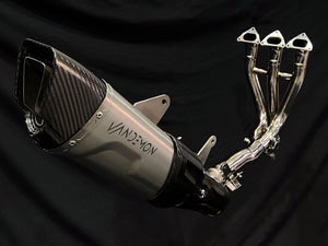 VANDEMON offers a complete titanium exhaust system featuring striking polished titanium headers and a brushed titanium finish muffler. This system enables unrestricted exhaust flow, delivering maximum sound and performance. By replacing the heavy OEM catalytic converter and steel muffler, it significantly reduces weight, leading to improved handling, reduced stopping times, and increased acceleration.
