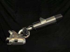 The system consists of two mufflers and a purpose-made titanium valve that, when closed, directs all exhaust first through the baffled Pre-muffler, which looks like a catalytic converter (that is no longer used) seen under the motorcycle and then lastly exits through the larger straight-through unrestricted LH muffler to give an exhaust tone as quiet as the OEM muffler. When the valve is switched to the open position via the handlebar-mounted switch, the exhaust will exit via the path of least resistance, which is the larger final muffler that has no exhaust restriction, releasing that glorious Triumph triple sound.