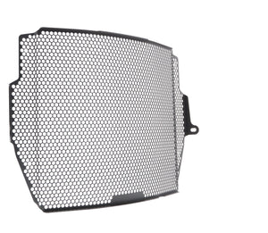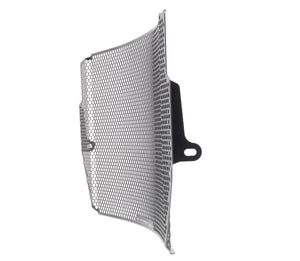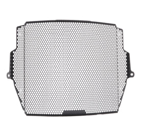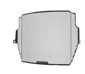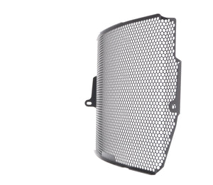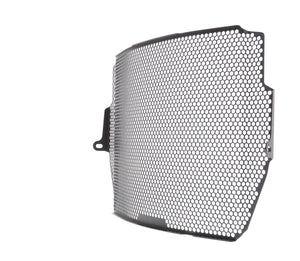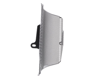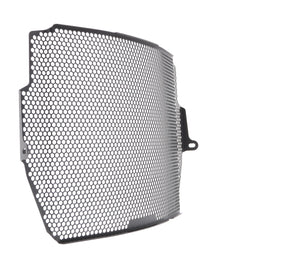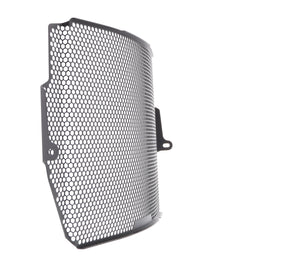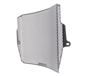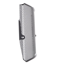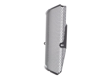 The EP Radiator Guard protects the Triumph Street Triple RS radiator from damage caused by road debris, while at the same time allowing all-important cooling air to pass through. The cooling fins of the standard radiator easily bend. Misaligned fins can restrict cooling air, which can lead to overheating. The radiator's core is also prone to being holed by stones from being picked up by the front tyre or other traffic and flung directly into this expensive component. Leaking coolant will make the motorcycle inoperable because of overheating, which, in turn, can lead to engine damage. Coolant could also leak onto the tyres to cause sudden loss of grip.